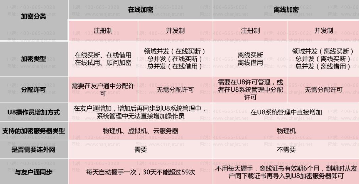 U8最新版本支持两种加密控制模式:注册制、并发制。具体可以分为在线加密、离线加密两种类别。