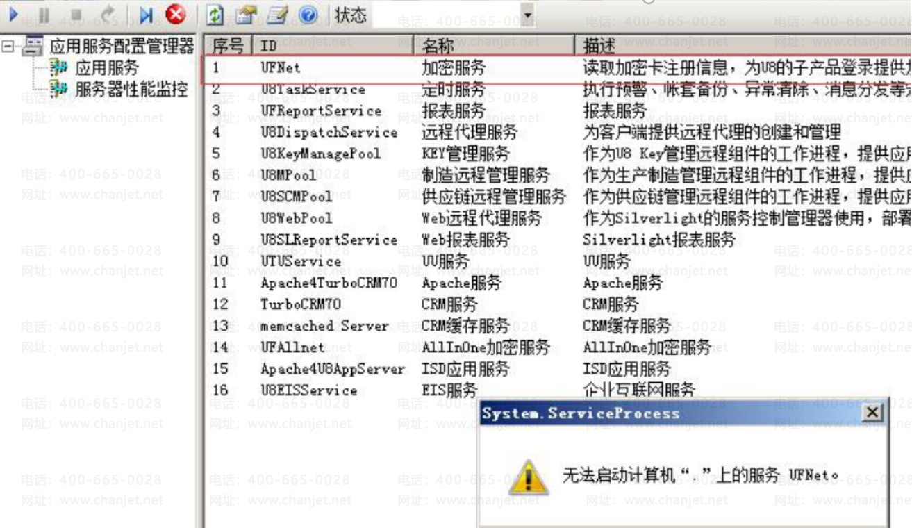 然后经过远程,看拥有各种服务是否启动,等看到用友加密服务器的时候,点启动也出现错误,U8加密服务无法启动,启动的时候提示“无法启动计算机“.”上的服务UFNet。”错误如下图所示;