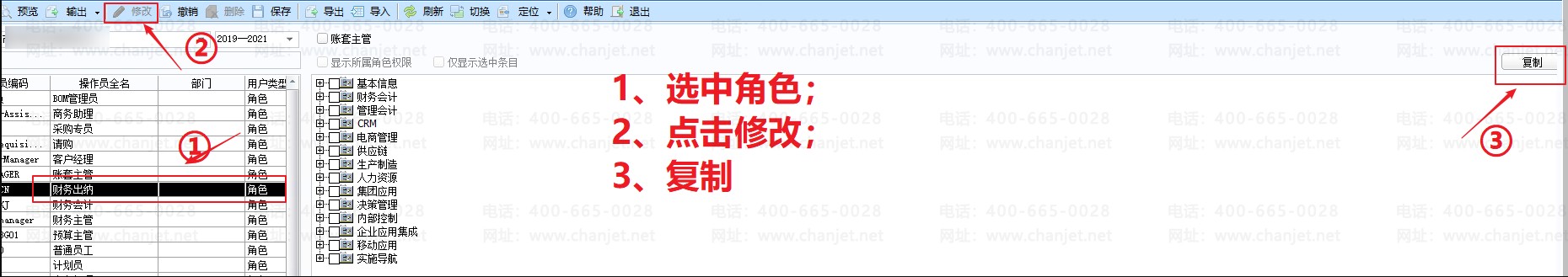 假如原账套是A,新账套是B,那A与B账套都要有相同的角色;此时就需要把A账套的角色权限复制过来(角色默认就有了,只需把权限复制过来),操作流程如下;