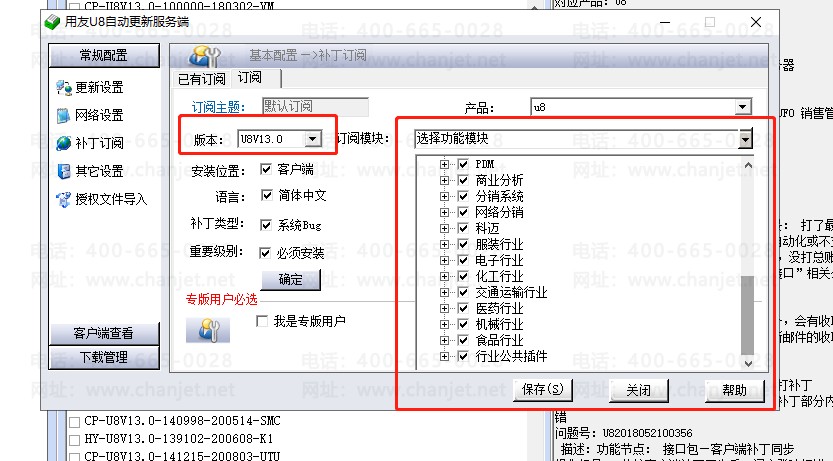 6、然后右下角 用友U8自动更新服务端 选择 服务端工具--补丁订阅--(选择你需要的版本,比如U8V13.0 然后右边-选择功能模块-全选即可)选择后点击保存即可,如下图