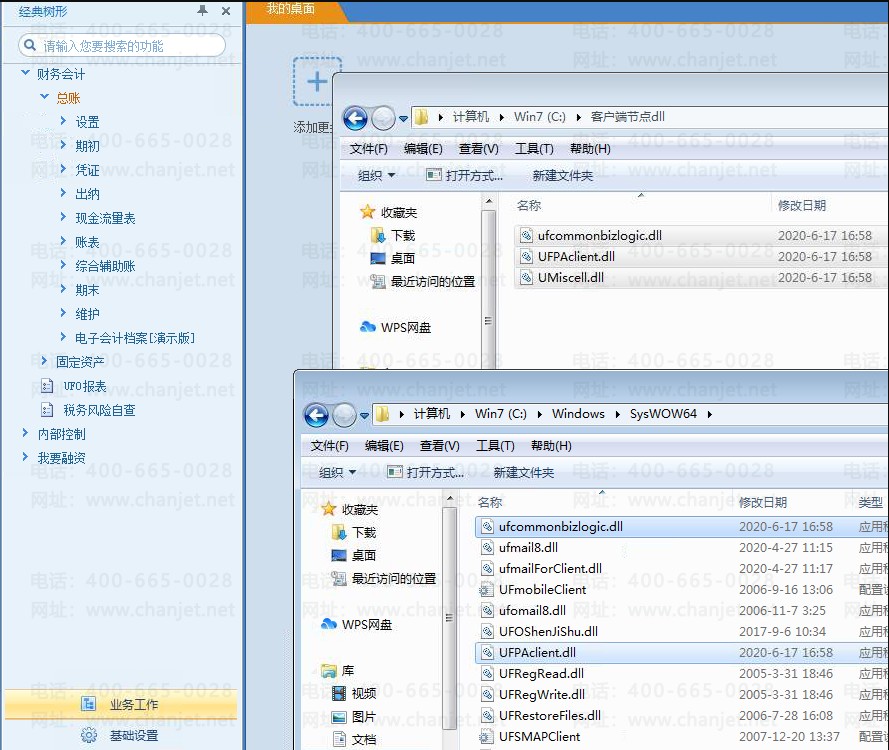 8、检查客户端的C:\WINDOWS\SysWOW64\目录下,有没有【UFPAclient.dll】【UMiscell.dll】【ufcommonbizlogic.dll】这三个文件。然后从服务器上或者登陆正常的电脑上复制这3个Dll文件覆盖有问题的电脑。