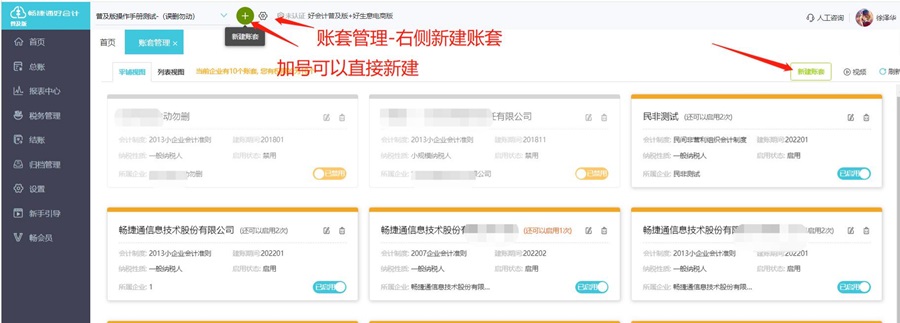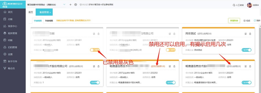 二、账套管理界面,账套名称后的【启用/禁用】按钮,可以将无需编辑数据的账套停用,停用的账套不占用好会计账号的账套数量,但可以查询账套内数据。系统限制反复交替开启账套,绕过账套数量限制,所以每个账套停用后,只有 2 次启用机会。灰色是已经禁用的账套。