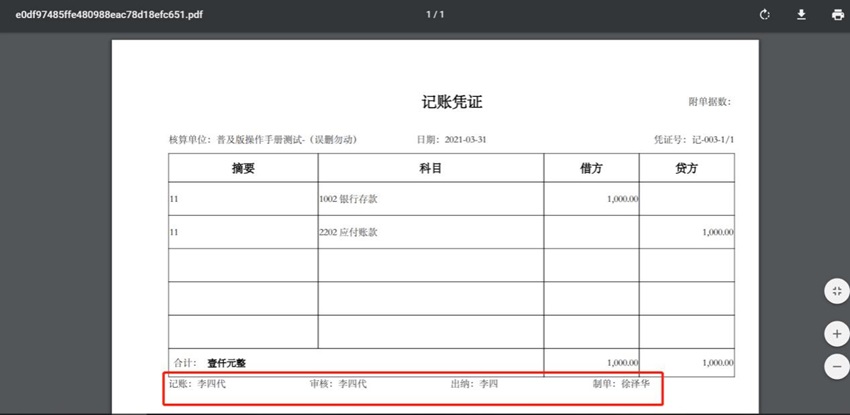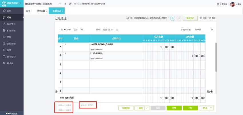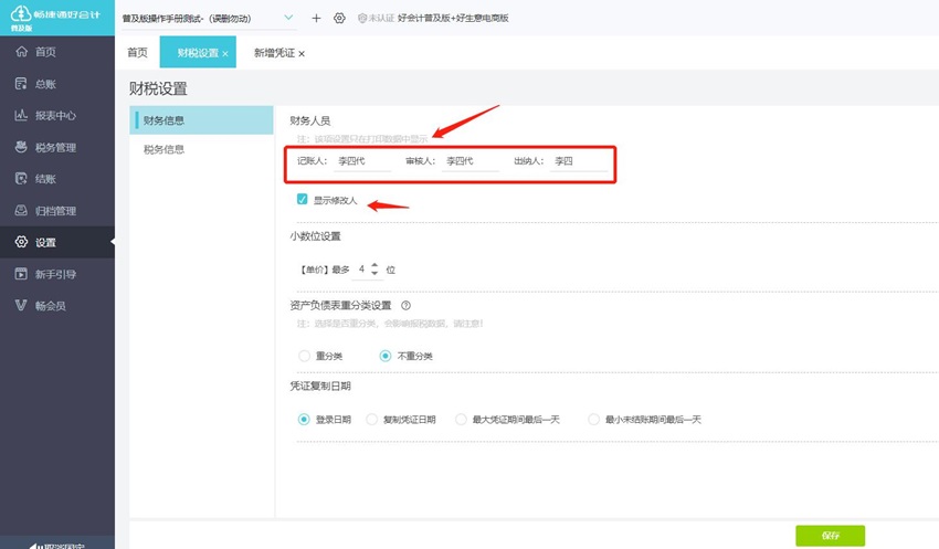 (7) 点左侧菜单栏【设置】【财税设置】可设置 记账人、审核人、出纳人,显示修改人,记账人、审核人、出纳人和制单人显示在打印凭证下方的名字。显示在打印凭证下方的名字。