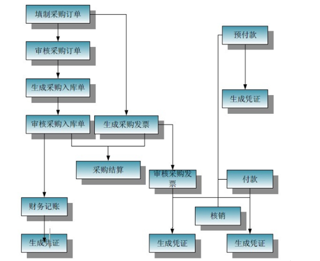 4. 简化流程,将采购部门与财务部门实现数据共享,减少重复工作。建议启用采购订单、采购发票与结算管理,实现财务与业务部门一体化。