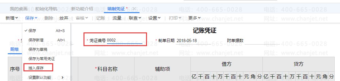 解决方法:在”填制凭证”界面,点击”新增”,录入凭证号,再点击”保存”按钮下的”插入保存”即可。