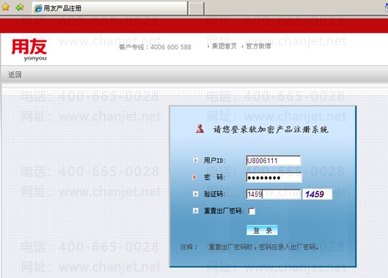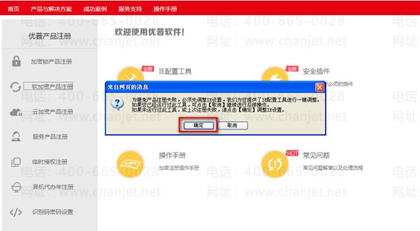 在注册网站http://register.yonyou.com/,点击左树分类【软加密产品注册】,弹出IE配置工具提示,选择【取消】,进入软加密产品登录界面如下图。