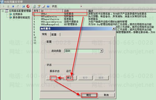 登录【U8应用服务管理】,选择【加密服务】,右键选择【属性】,在常规选项卡,依次点击【停止】、【启动】,进行加密服务重启。如下图。