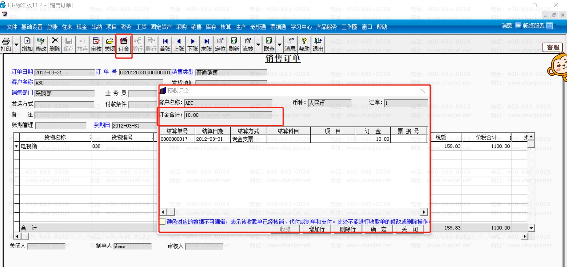 ①”销售订单“保存之后,点击【订金】,然后再点【增加行】,录入订金信息后保存会形成预收款