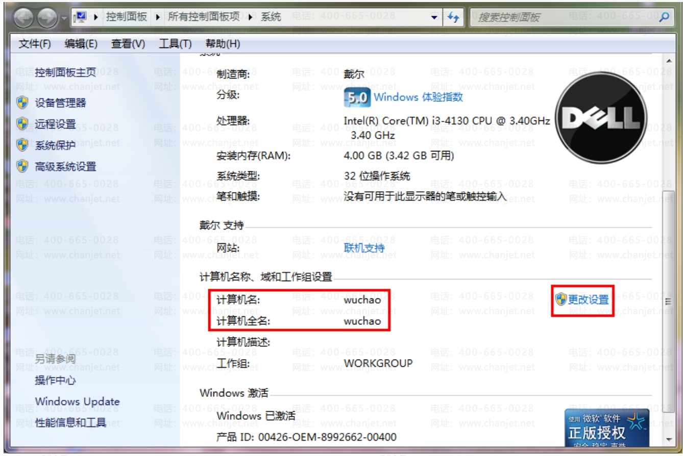 2、如果位数过多,或者有特殊字符,那么依次点击:“更改设置-更改”,在计算机名称中输入8位数以内的英文字母后点击“确定”,并重启电脑。