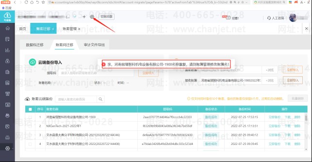 在【账套管理】点击编辑修改账套名称后再来进行导入,直接修改下载的data格式文件的文件名称也是会提示重复的。