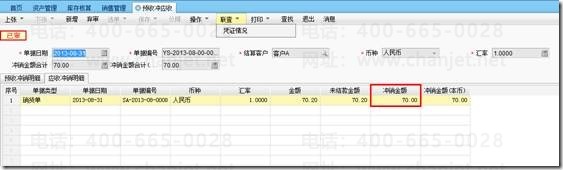 3、往来冲销-预收冲应收,冲销70元,0.2元不收,先做往来冲销单,冲销70