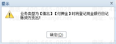 保存时会提示“业务类型为【借出】【付押金】时将登记现金银行日记账贷方支出!”