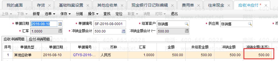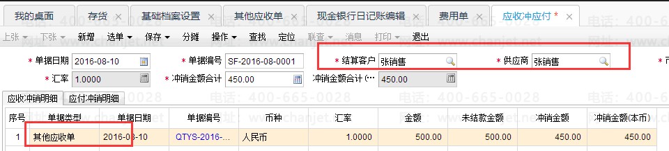 (2)点击往来现金——应收冲应付,结算客户与供应商均为“张销售”,将其他收款单和费用单450元进行冲销