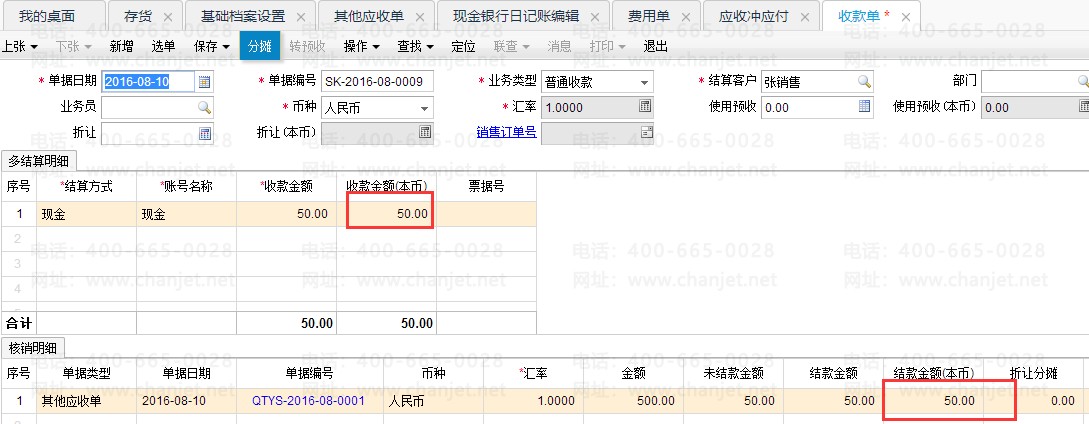 (3)由于当时借出的金额有富余,业务员需归还,则填制一张50元的收款单与其他应收单核销即可。