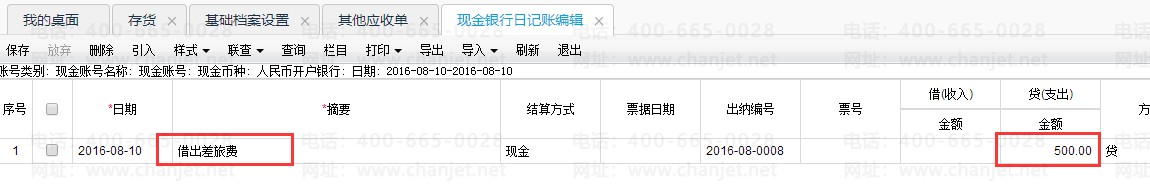 3、勾上上述选项的情况下,再到日记账账户中查看,会自动在现金账号中增加一笔“借出差旅费”的记录,日记账账户余额减少。