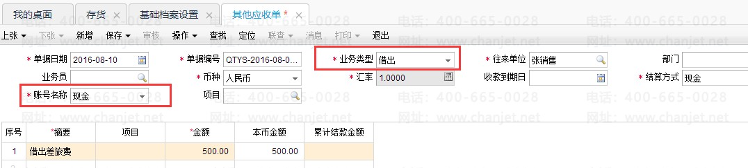 2、借出差旅费时,新增一张其他应收单,业务类型选择为“借出”, 金额为500,