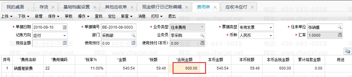 (3)由于之前预支的金额不足,业务员垫付了100,所以需再填一张付款单与费用单核销。