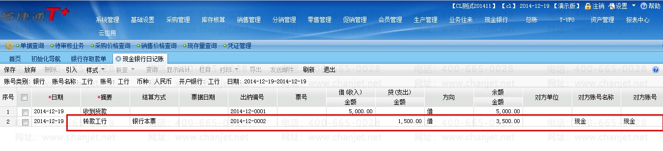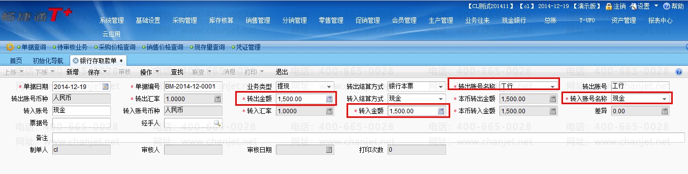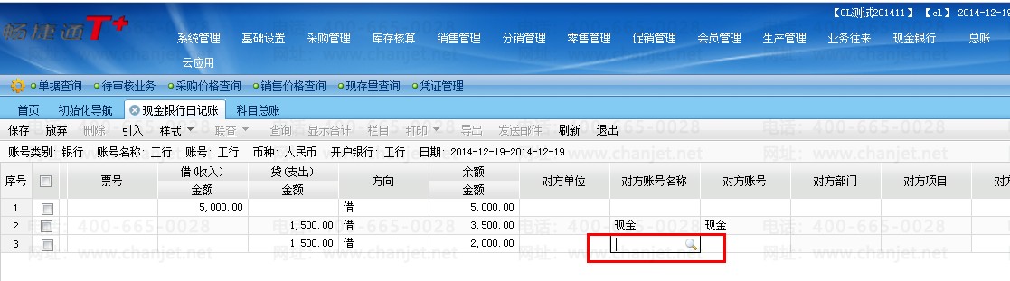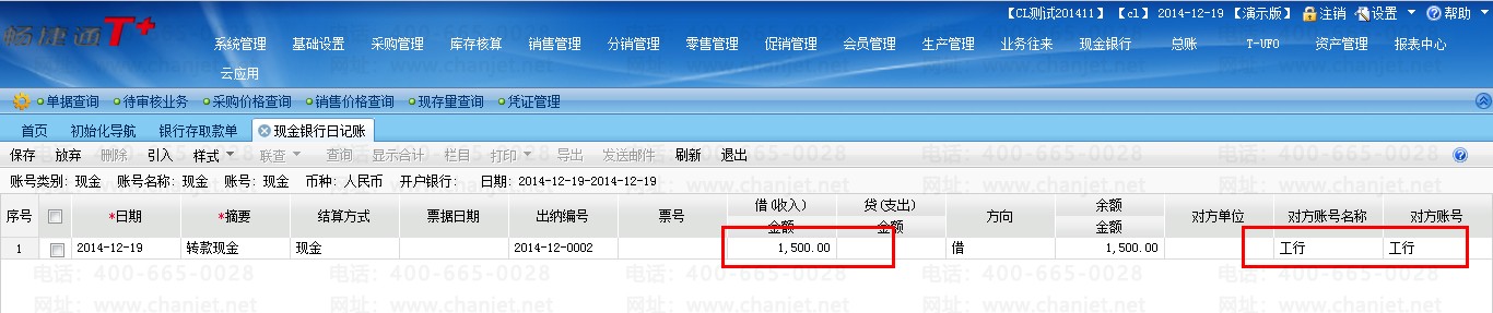 2、单启用现金银行——出纳模块时,没有现金银行存取款单,可以直接在现金或银行账号中录入数据,并选择对方账号,系统会自动在对方账号中生成相应的增加或减少的记录(注:此功能为T+11.6新增功能)