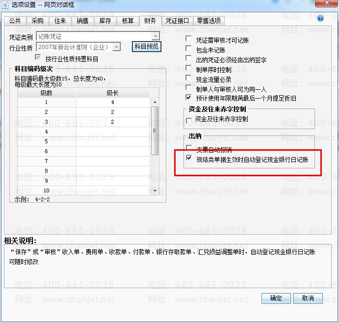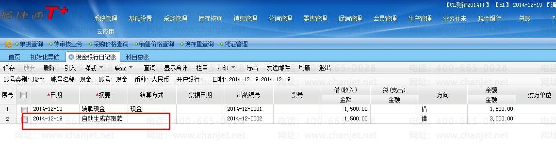 注:若在系统管理”——“账套设置”——“选项设置中勾选现结类单据生效时自动登记现金银行日记账,做完银行存取款单后,系统会自动在转入转出账号中生成增加或减少的记录。