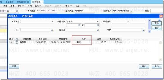 新增一张收款单,点击选单选中币种为美元的销货单,可以按照币种进行过滤