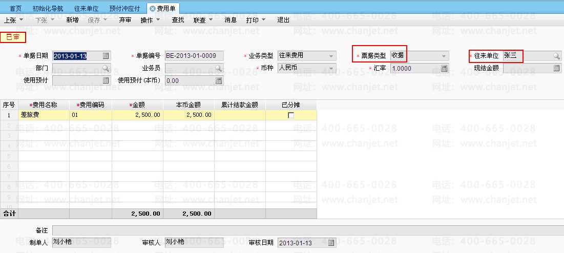 报销差旅费时,填制一张费用单,单据类型为“收据”,金额为2500元。
