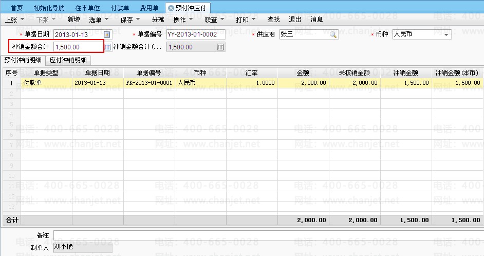 费用单进行审核之后,做预付冲应付的操作,将之前的付款单2000元的记录冲销。