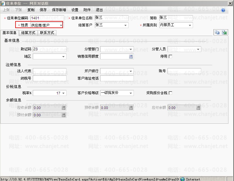 1、在“基础档案”—“常用信息设置”—“往来单位”中增加员工的信息。将性质设置为“供应商/客户”。