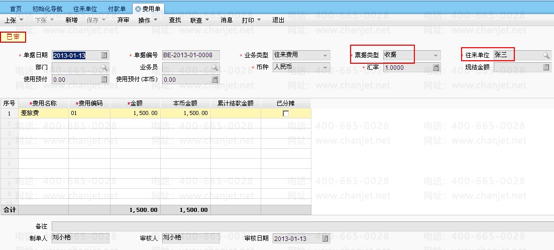 报销差旅费时,填制一张费用单,将票据类型设置为“收据”,金额为1500元。