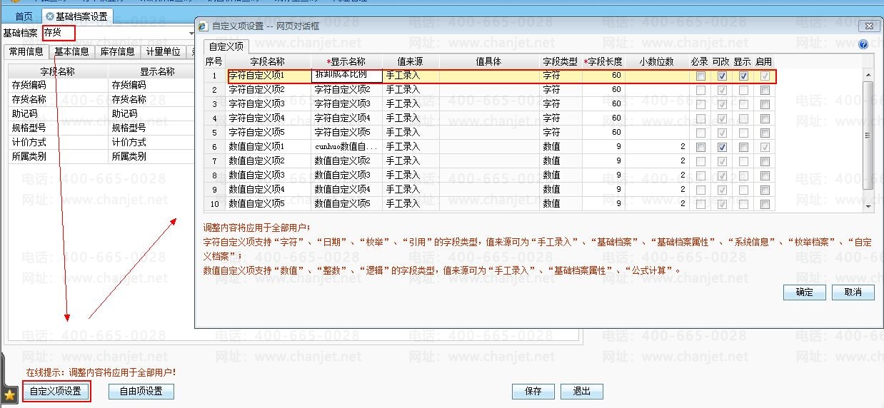 (1)依次点击“系统管理”-“基础档案设置”-“基础档案设置”按钮,基础档案找到找到“存货”,点击“自定义项设置”,启用一个存货自定义项,名称为“拆卸比例”,值来源为“手工输入”: