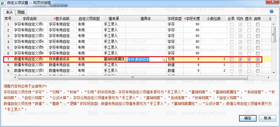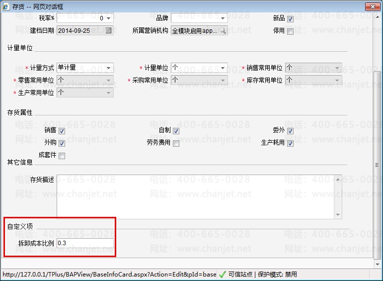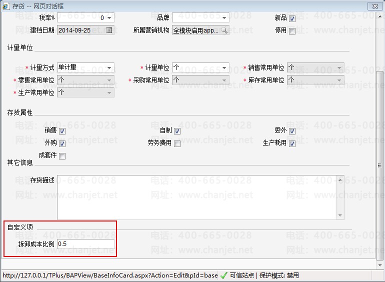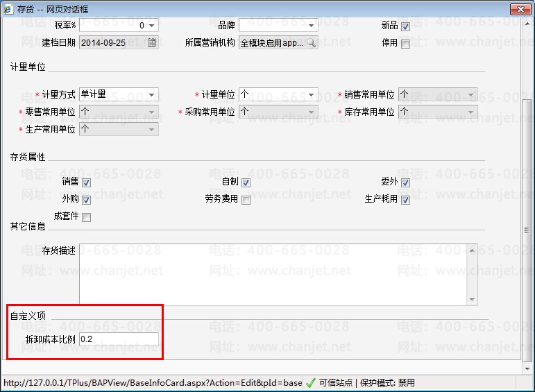 2、A可以拆卸成为B、C、D三种零件,可以算出他们的成本比例分别为0.2、0.3、0.5,把成本比例作为自定义项录入到存货档案中:
