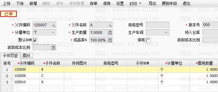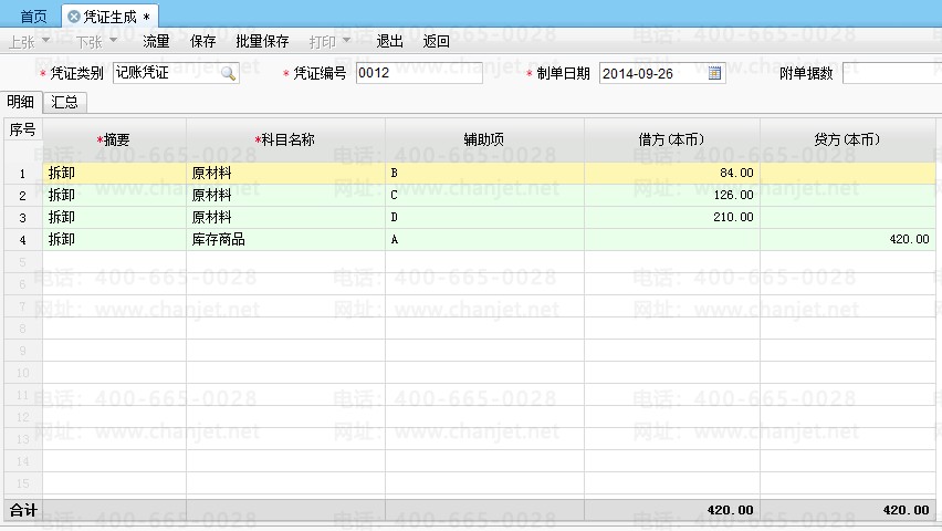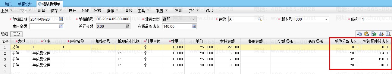 5、做组装拆卸单,拆卸单在录入的同时,单据填写人员根据表体计算的值录入材料金额列,拆卸的子件成本便实时运算出来: