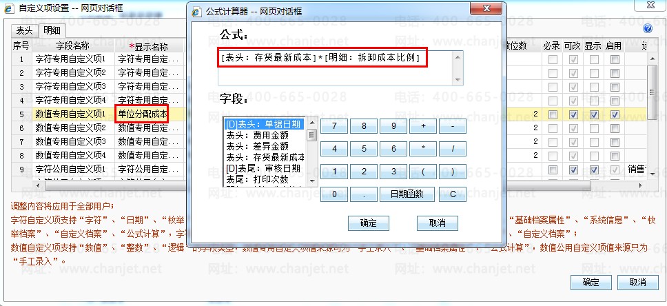 (1)“明细”启用第一个数值自定义项,名称为“单位分配成本”,来源为“公式计算”,值具体为“存货最新成本*拆卸分配比例”: