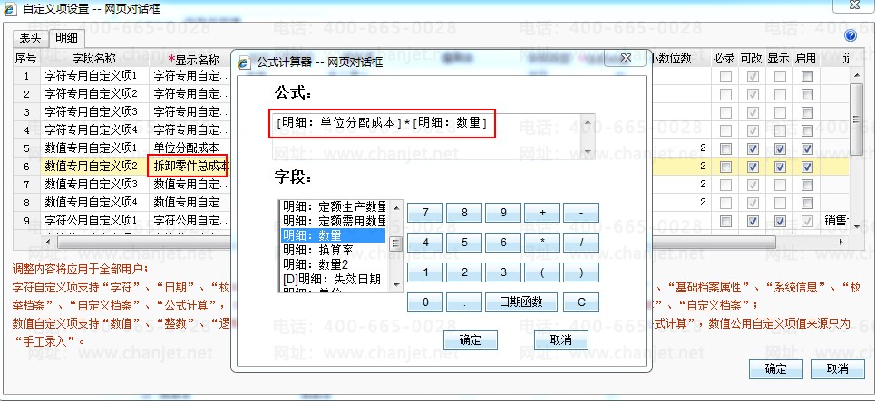 (2)明细启用第二个数值自定义项,名称为“拆卸零件总成本”,来源为“公式计算”,值具体为“单位分配成本*数量”: