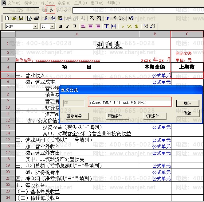 “select(?B5,年@=年 and 月@=月+1)”意思为取本报表文件中上月对应的表页B5单元格的值(注意:用此公式必须采用追加表页的形式,才能取到上期数,在第3步中会讲追加表页的方法。),如,“营业收入”单元格为C5,此处公式应改为select(?B5,年@=年 and 月@=月+1),如下图:
