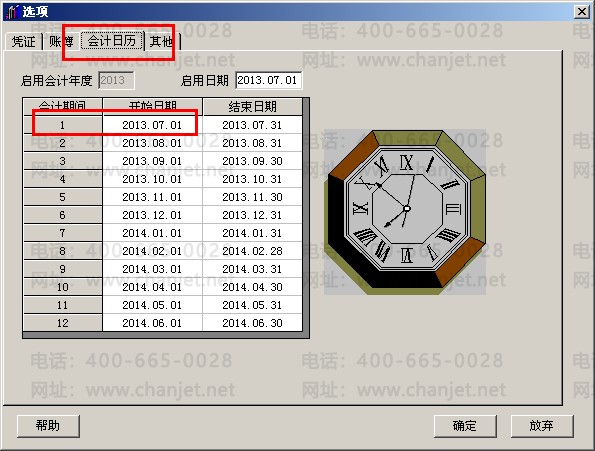 1.依次点击总账—设置—选项—会计日历,确定2013年7月1号到31号是否是第1个会计期间: