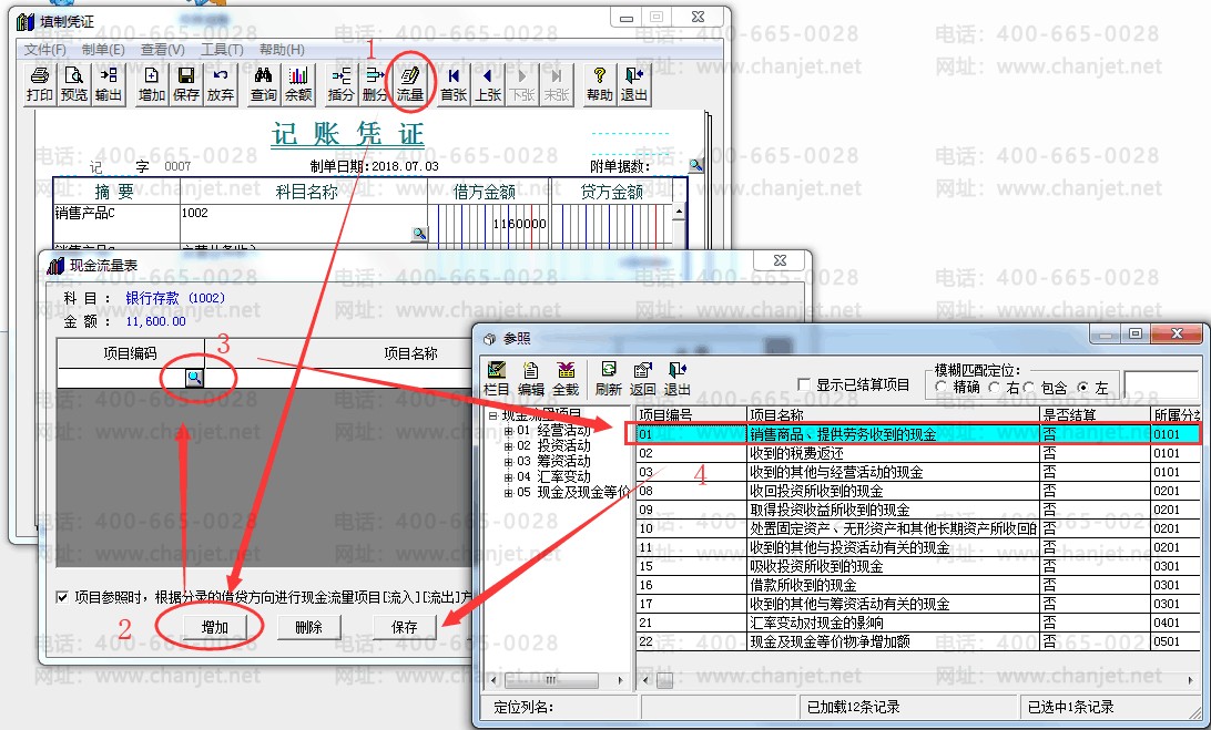 第四步:在【填制凭证】中选择科目,需要录入流量项目。