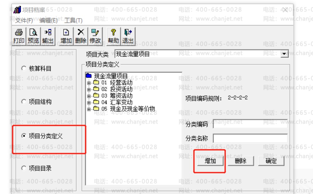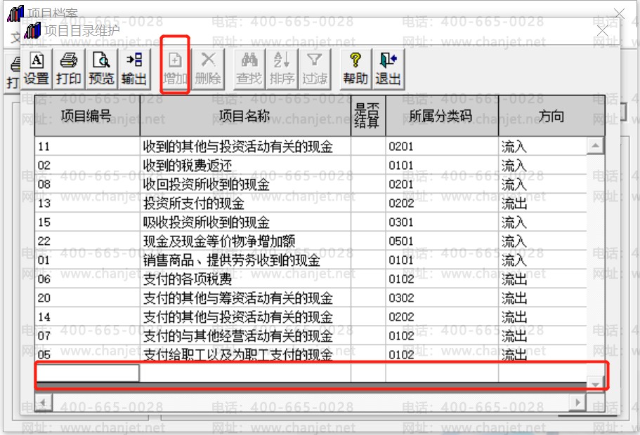点击【增加】后在白框处输入项目编号、项目名称、所属分类码、方向