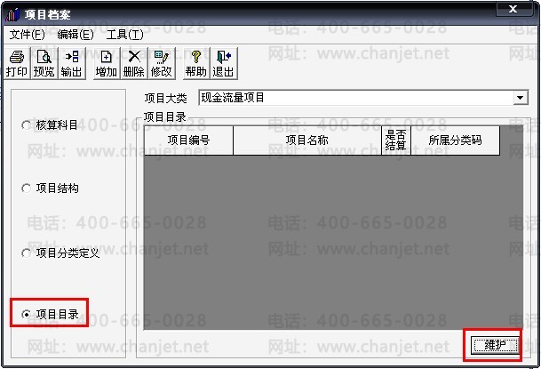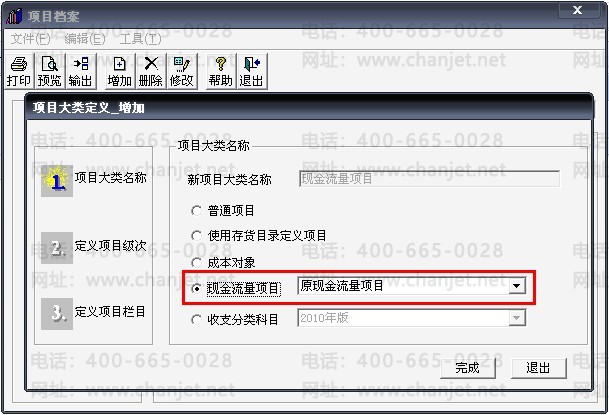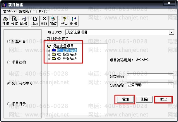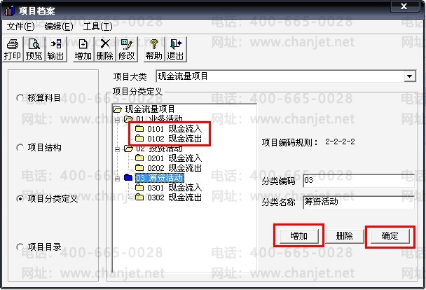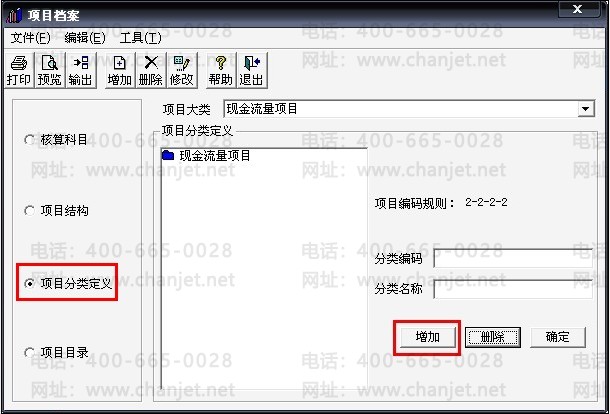 9、打开报表后再回到现金流量项目界面,选择“项目分类定义”后点击“增加”
