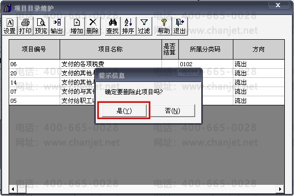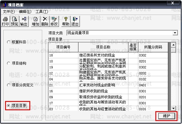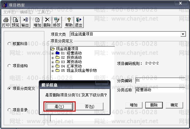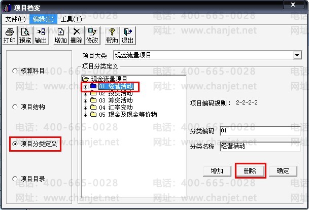 6、点击“项目分类定义”,将“现金流量项目”的分类全部删除