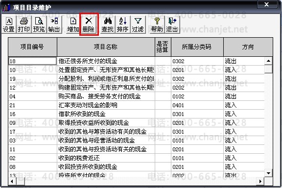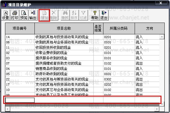 13、点击“增加”,增加现金流量表上的各项目(项目编号从1开始按顺序随意填写,项目名称按现金流量表上的项目依次填写)