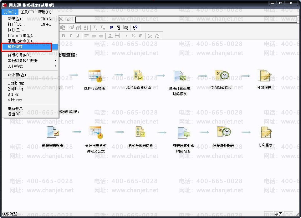 7、全部清空之后,暂时关闭项目档案窗口,进入“财务报表”-“文件”-“模板调整”