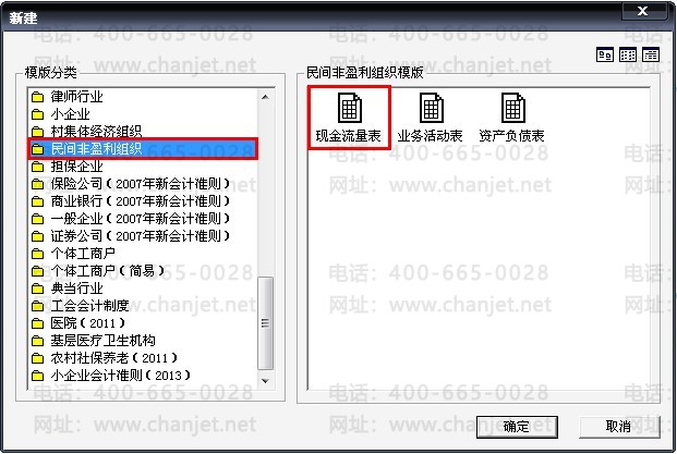 8、选择“民间非盈利组织”的行业性质和“现金流量表”模板