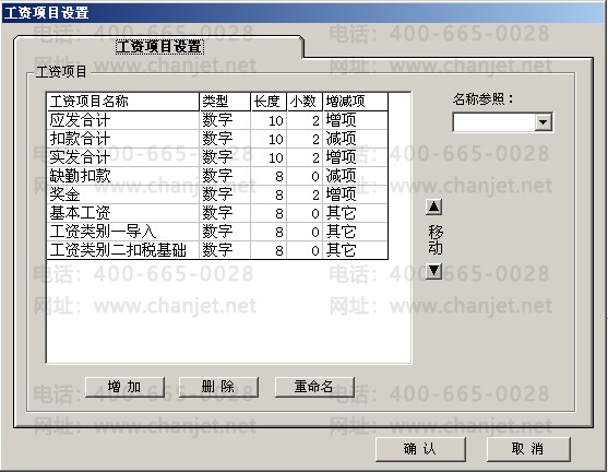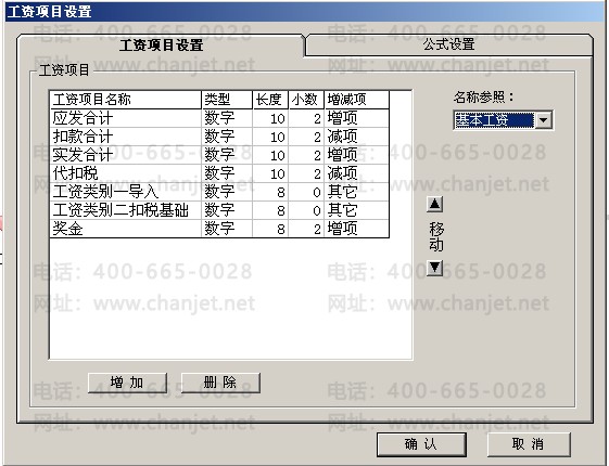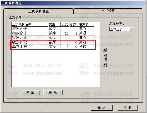 3、关闭所有工资类别,在“设置”中增加工资项目:基本工资、奖金、缺勤扣款、工资类别一导入(其它)、工资类别二扣税基数(其它)