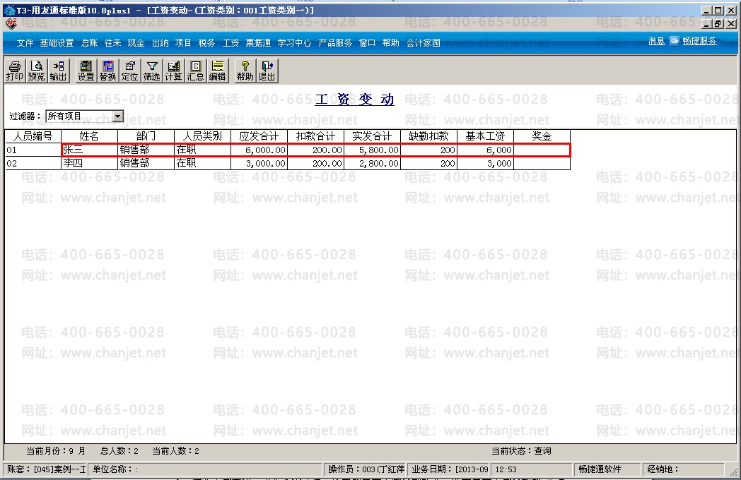 5、进入工资变动,录入人员的工资,进行工资计算和工资汇总。假定本月张三基本工资为6000,缺勤200元,则“实发合计”为5800元