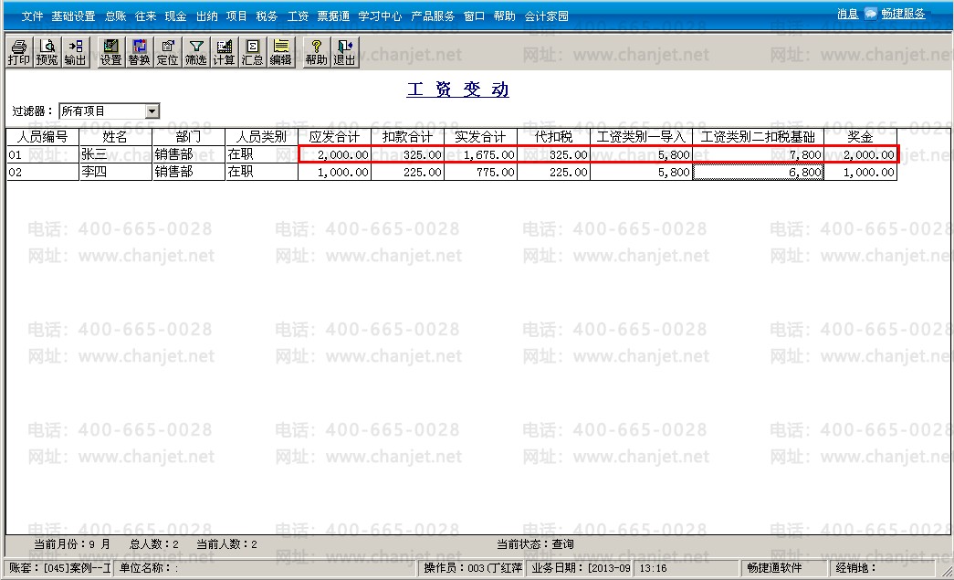 9、点击工资变动界面的“计算”—“汇总”,可以看到工资类别二扣税基础为7800,代扣税为325,是按照发放工资和奖金合计数计算的。