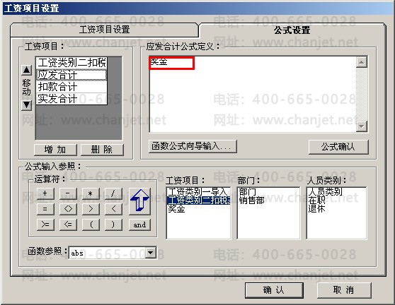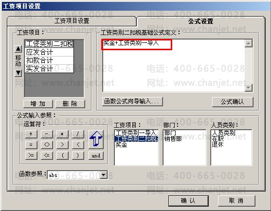 7、对工资类别二进行工资项目和公式的定义,增加项目:工资类别一导入、工资类别二扣税基础和奖金,设置工资类别二扣税基础为:奖金+工资类别一导入,应发合计就是应发的奖金
