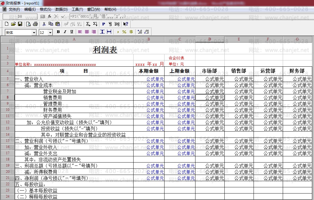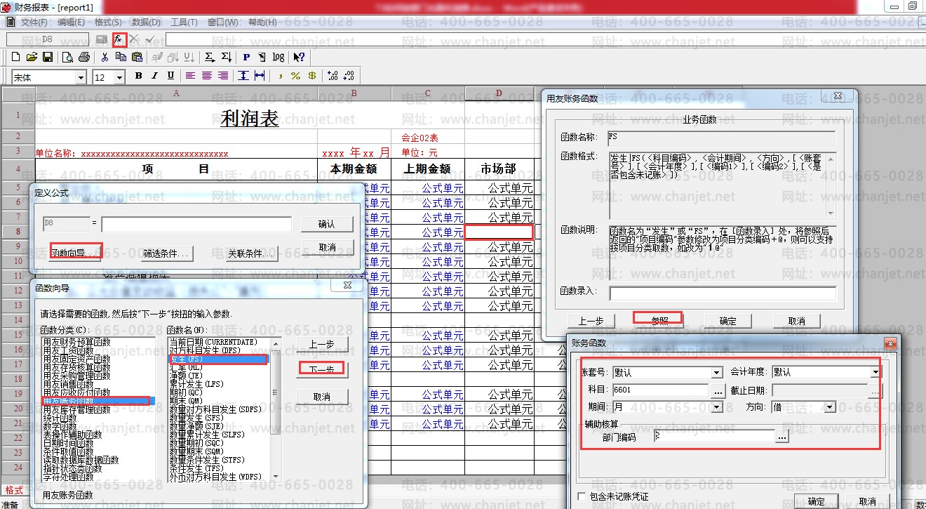 6、在报表“格式”状态下,选中“市场部”公式单元,点击菜单栏中的“fx”按钮。选择函数向导-用友账务函数-发生(FS)-参照,填写对应的数据。