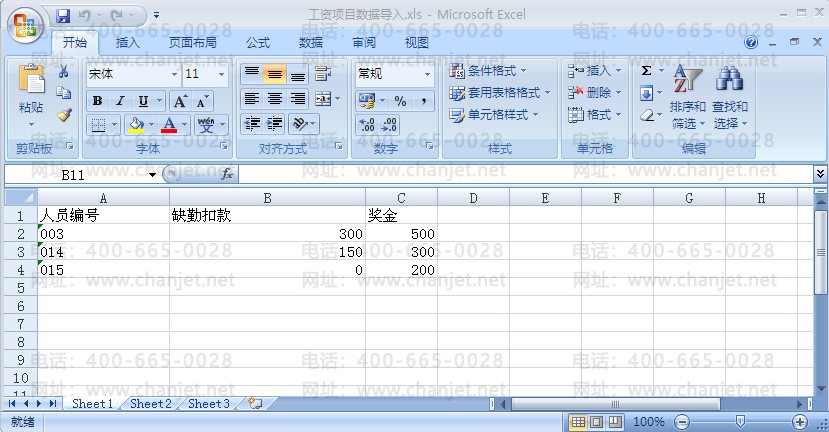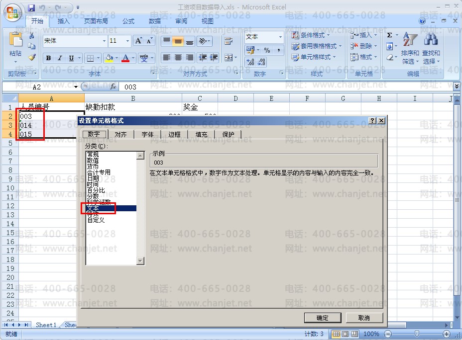 (1)设置外部文件,如excel文件,要求导入的excel文件后缀为xls。在excel表格中增加“人员编号”,将这一列修改为“文本”格式。再增加其他需要导入的工资项目,如“奖金”,“缺勤扣款”。