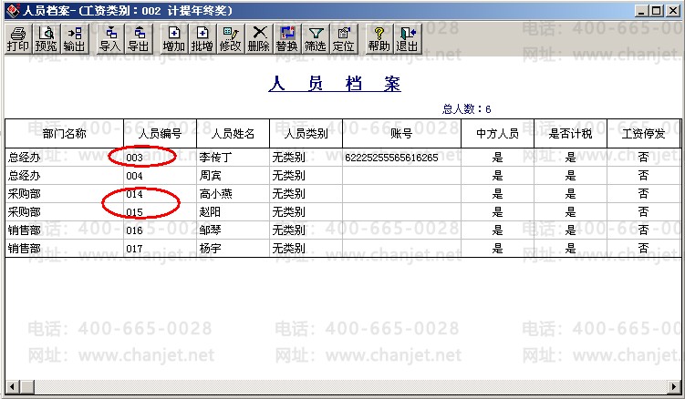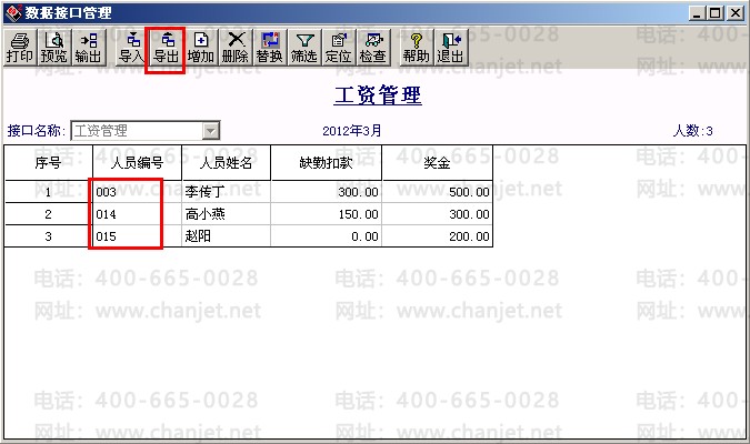 (4)点击“数据导入”之后,软件中就显示了excel文件中的内容,并带出对应人员的姓名,确认数据无误之后,点击“导出”: