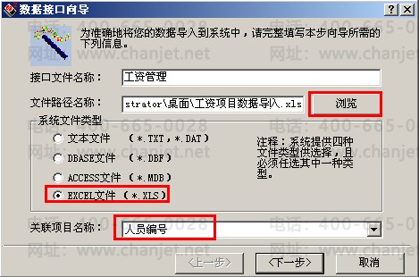 (3)a、在数据接口向导界面点击“浏览”选择已经设置好的本地excel文件,选择系统文件类型为“excel文件”,并选择设置关联项目名称,这个项目名称是软件中项目名称,比如:人员编码。
